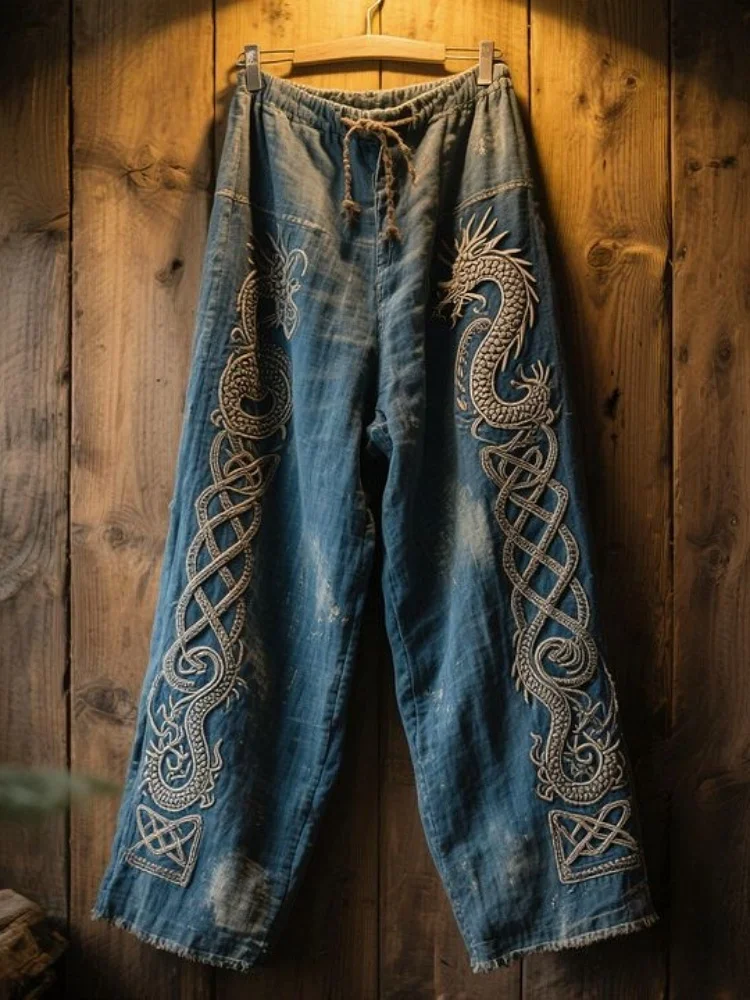 New 3D Dragon-print Men’s Long Pants Nordic Viking Myth Style Men’s Drawstring Pants Outdoor Casual Loose Sport Pants