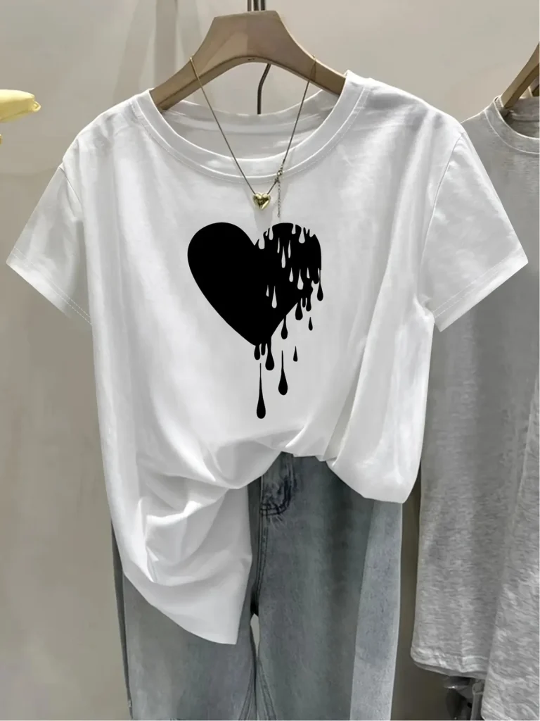 Women’s Korean Japanese Style White with Black Drip Heart Print Harajuku Short Sleeve Casual Clothing Street Aesthetic Clothes