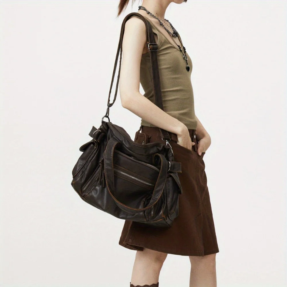 Retro tote bag motorcycle bag soft PU leather large capacity shoulder bag Y2K punk multi pocket crossbody bag