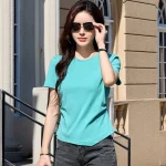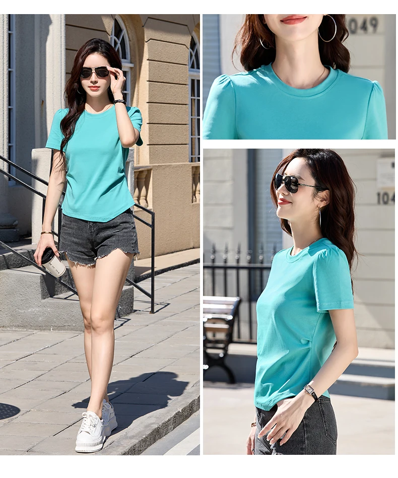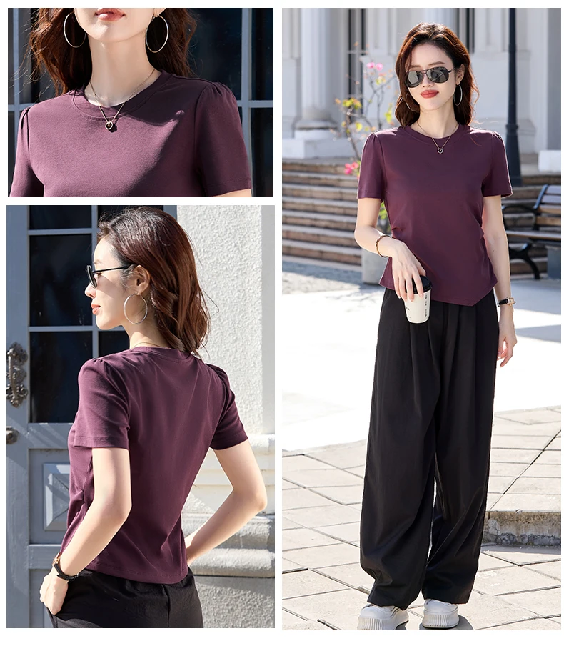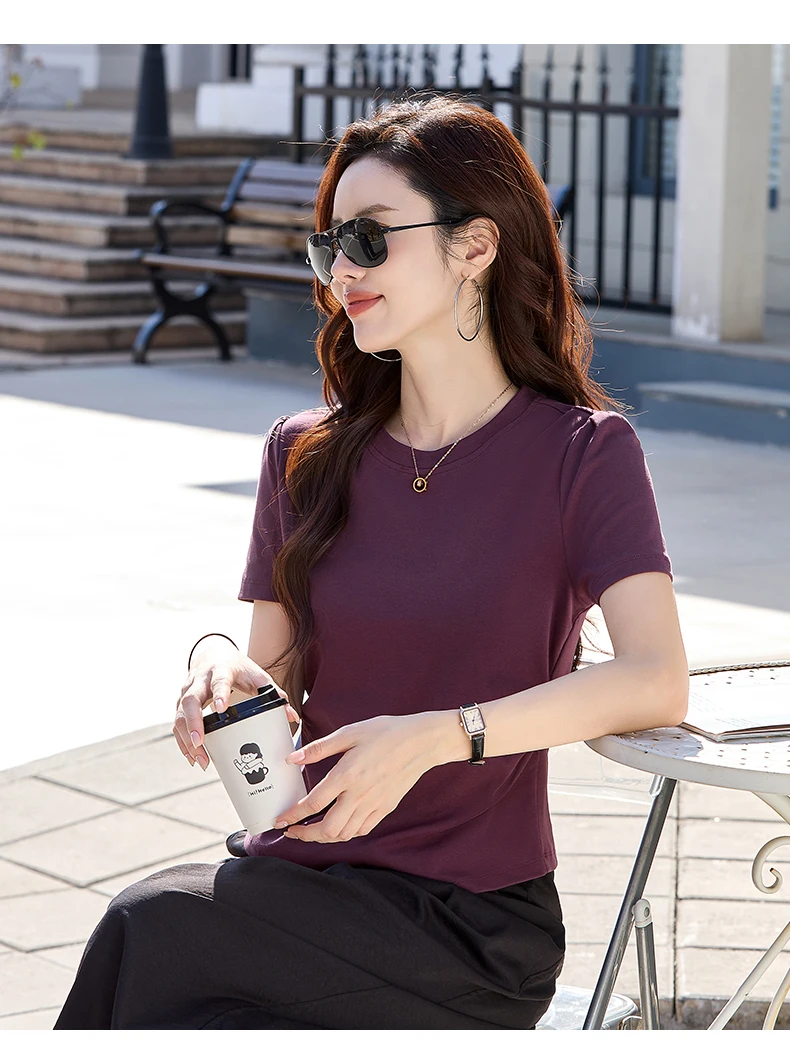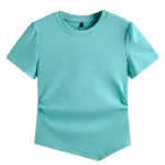 Be the first to review “New elegant style short sleeved triangular hem round neck solid color slim fit cotton women’s T-shirt”