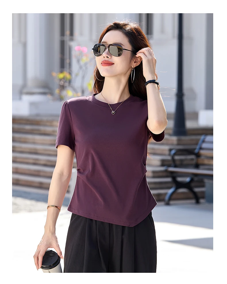 New elegant style short sleeved triangular hem round neck solid color slim fit cotton women’s T-shirt